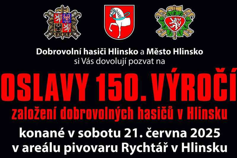 Dobrovolní hasiči působící v Hlinsku a město Hlinsko si dovolují pozvat širokou veřejnost na oslavy 150. výročí založení dobrovolných hasičů v Hlinsku, které se uskuteční v sobotu 21. června 2025 v areálu pivovaru Rychtář v Hlinsku.