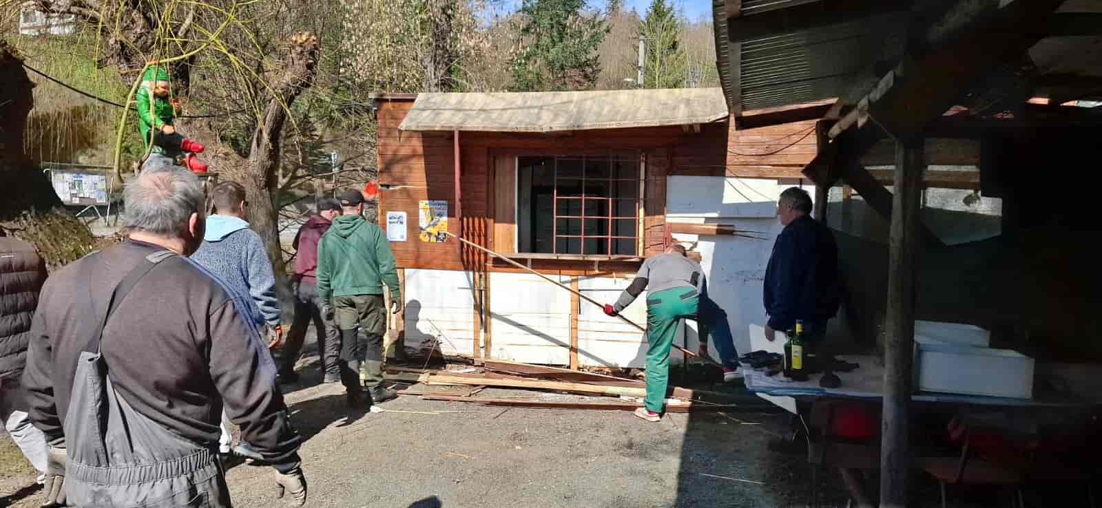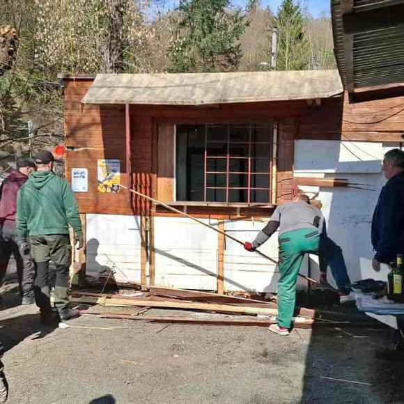 Třetí skupina se vrhla na stánek pana "Krásy" a s ním spojené "zázemí" a po rozbourání vše naložila do kontajneru k likvidaci. Na jeho místě bude, jak všichni doufáme, brzy stát zcela nový stánek, který bude přinášet pohodu a místo setkávání nám všem i návštěvníkům.